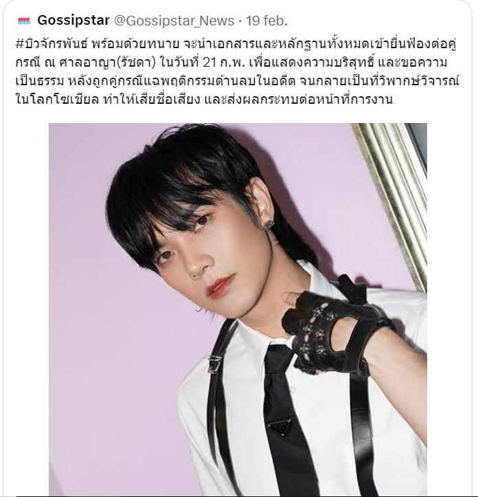 บิวจักรพันธ์ (Build) junto a su abogado presentará todos los documentos y pruebas para la demanda contra las partes en el Tribunal Penal (Ratchada) el 21 de febrero para demostrar su inocencia. Pide justicia después de haber sido expuesto por la otra parte por un comportamiento negativo en el pasado hasta ser criticado en el mundo social y ser desacreditado afectando sus actividades laborales.